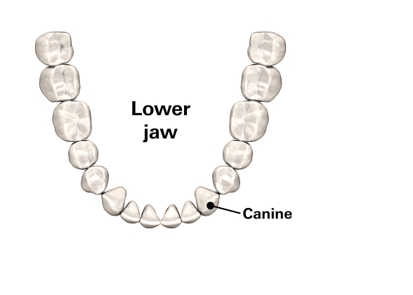 • Right next to the incisors, there is one canine on each side. As the name suggests (canine, from Latin “doglike”), they go back to the fangs of animals. They are pointed and cone-shaped. Like incisors, canines are used to cut or bite off food and are important pressure points during the chewing process.